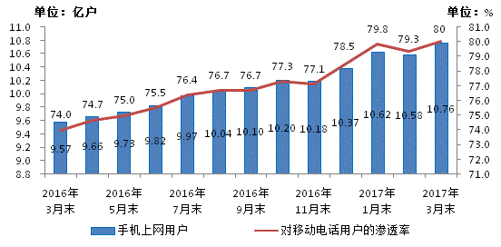 2016-2017年3月手機(jī)上網(wǎng)用戶(hù)和對(duì)移動(dòng)電話(huà)用戶(hù)滲透率情況